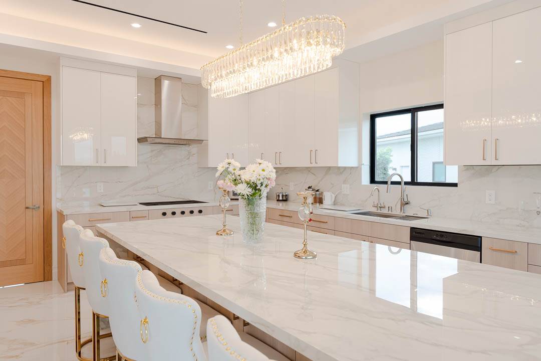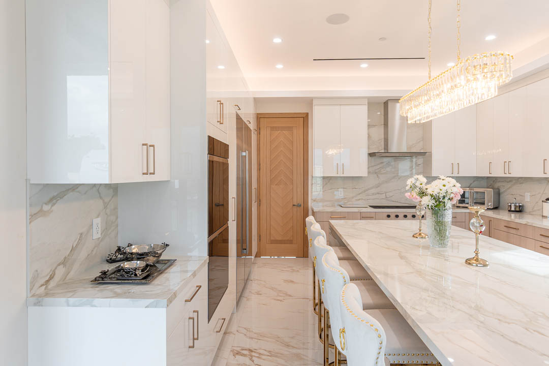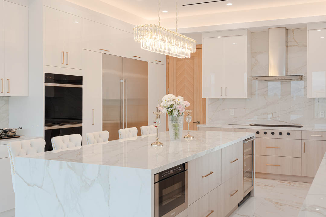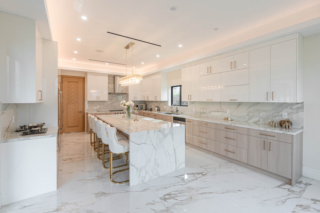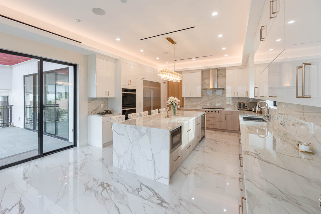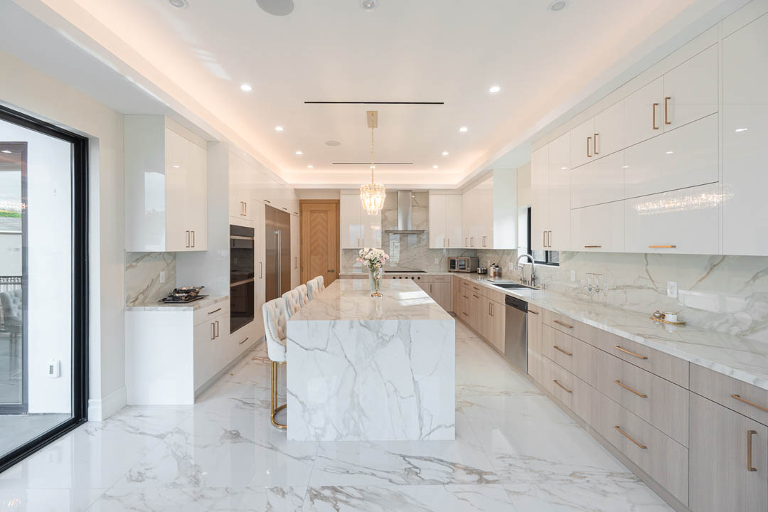 This luxury Tarzana home remodel features a complete custom kitchen and fully built out closets designed and installed by MTD Kitchen. The kitchen showcases a bright and elegant aesthetic with high gloss white cabinetry paired with warm textured wood tones. A large stone waterfall island becomes the centerpiece of the space and provides seating, storage, and integrated appliances. The full height stone backsplash, premium lighting, paneled refrigeration, and organized pullout storage create a clean and sophisticated environment for cooking and entertaining.
