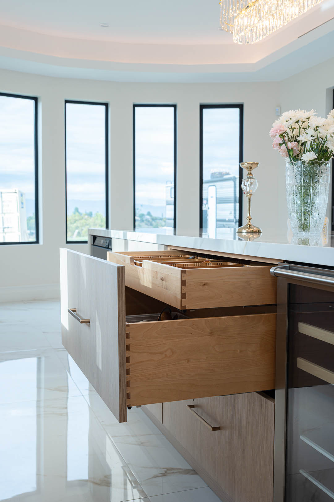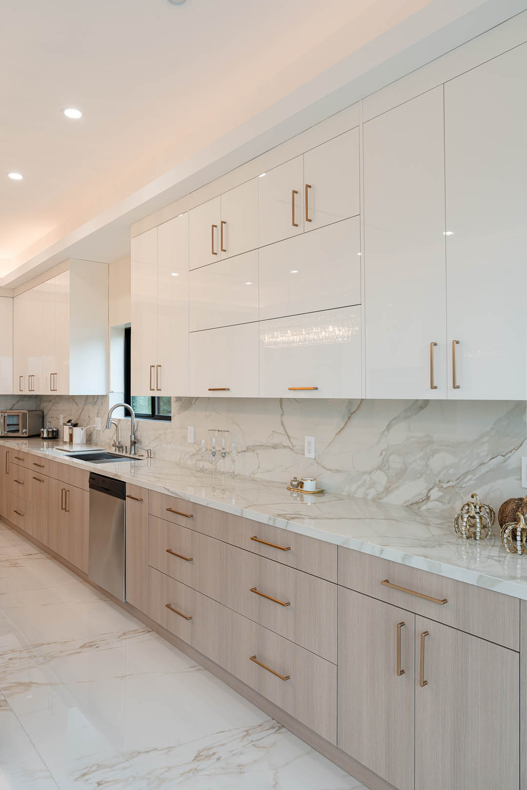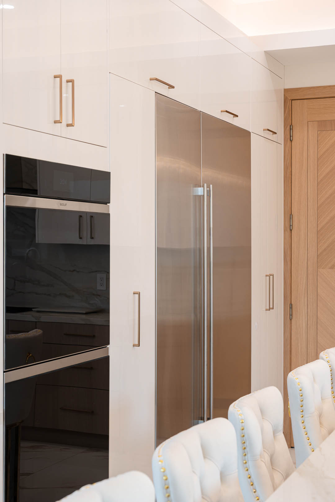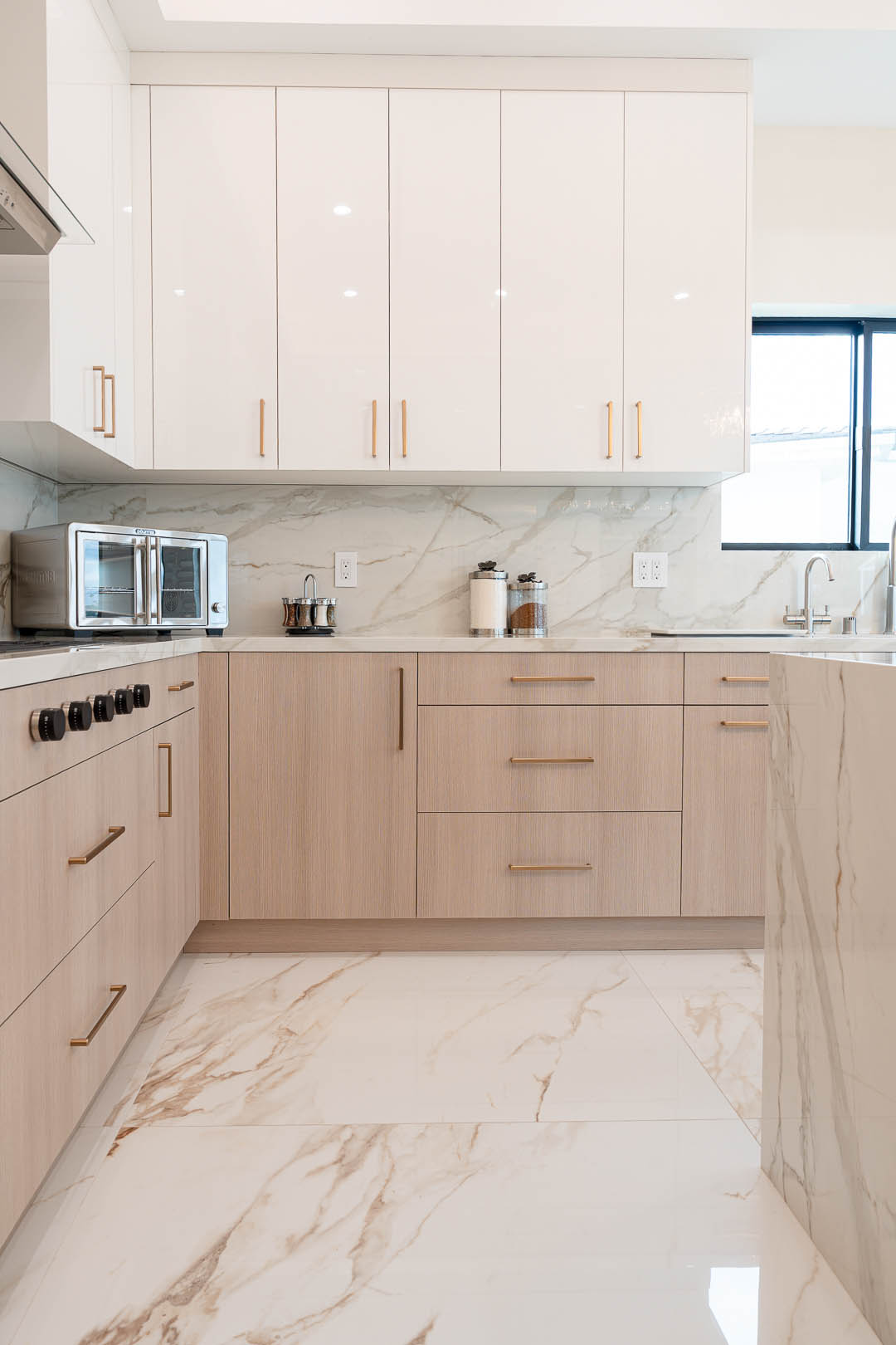 This luxury Tarzana home remodel features a complete custom kitchen and fully built out closets designed and installed by MTD Kitchen. The kitchen showcases a bright and elegant aesthetic with high gloss white cabinetry paired with warm textured wood tones. A large stone waterfall island becomes the centerpiece of the space and provides seating, storage, and integrated appliances. The full height stone backsplash, premium lighting, paneled refrigeration, and organized pullout storage create a clean and sophisticated environment for cooking and entertaining.