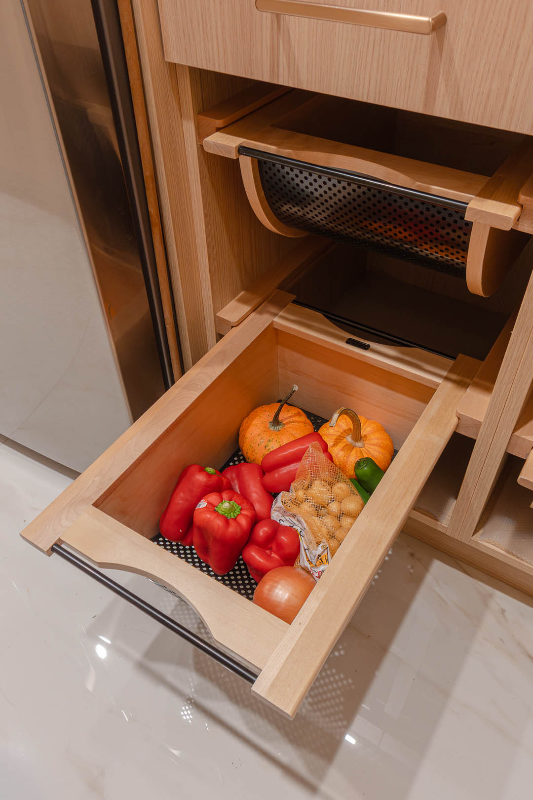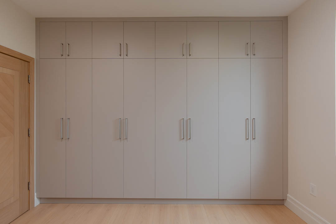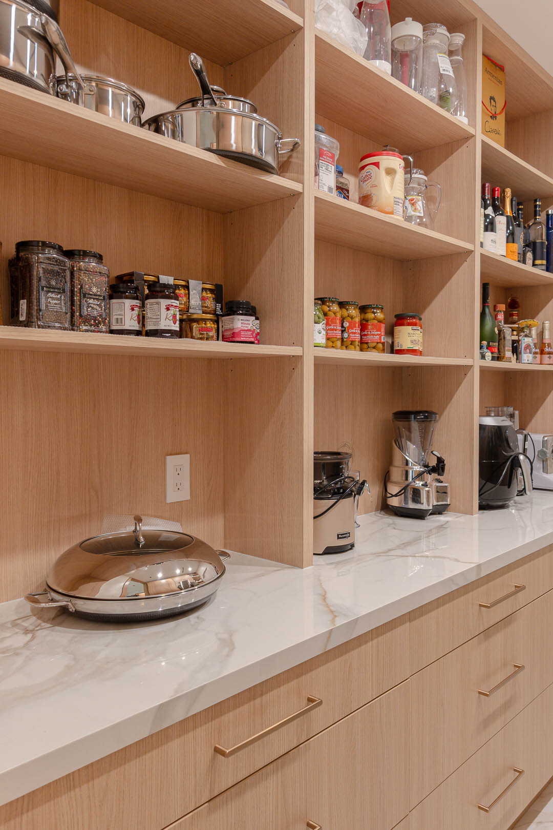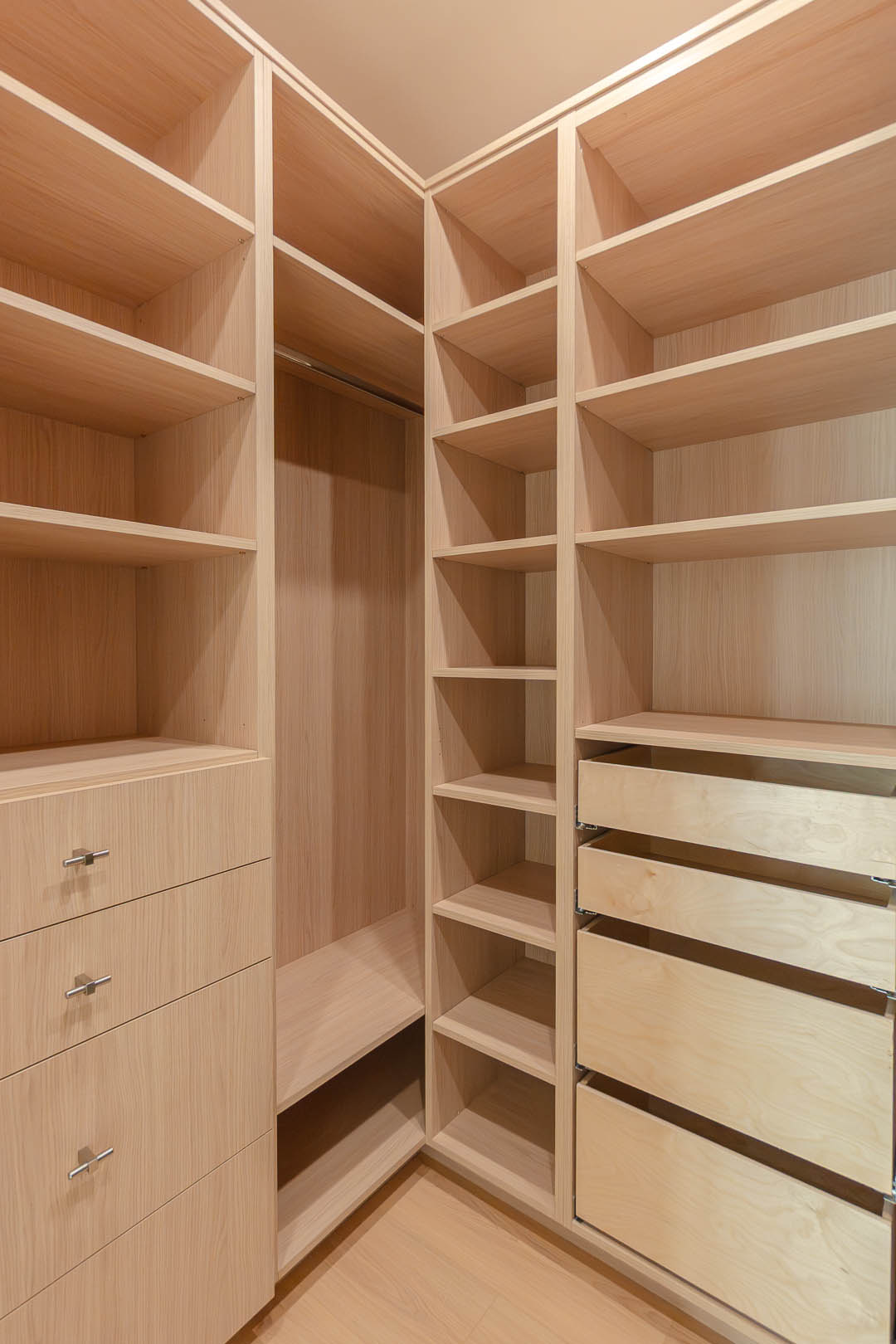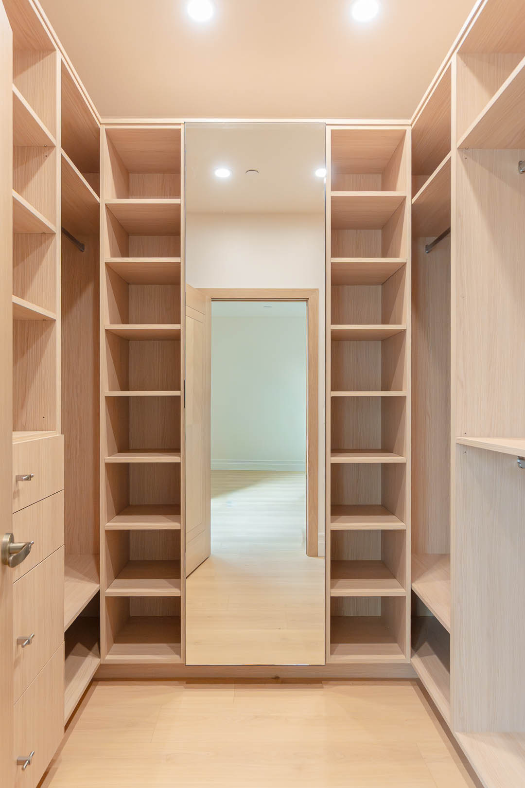 Beyond the kitchen, MTD Kitchen also crafted custom closets throughout the home. Each closet includes carefully planned shelving, soft close drawers, open storage towers, and specialty compartments that maximize organization and create a sleek, built in look. Natural wood tones and high quality craftsmanship bring warmth and uniformity to the entire space.
