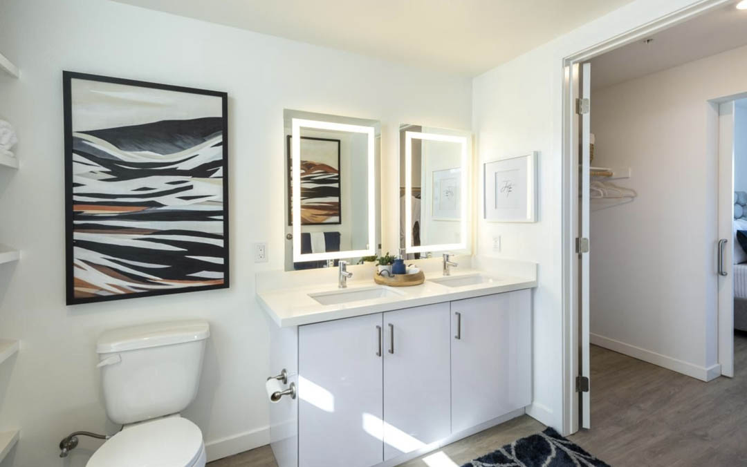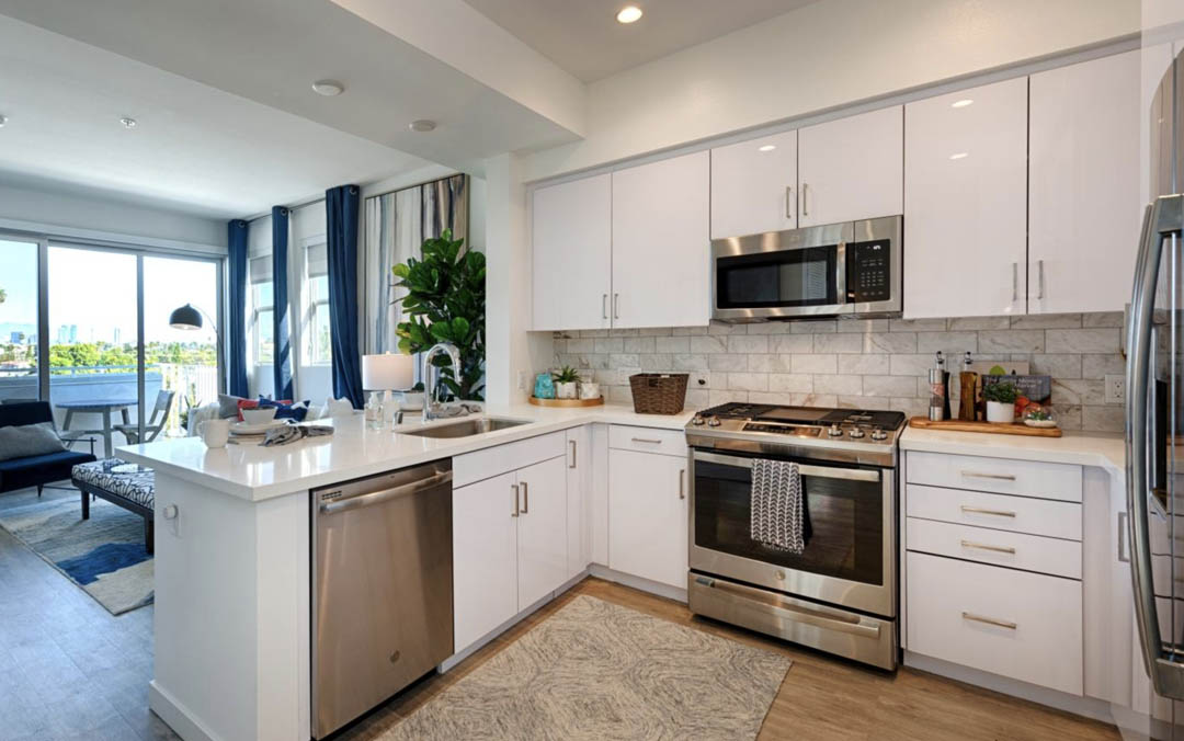 MTD Kitchen partnered with Jamison Services to provide complete cabinetry solutions for Jayden, a seven story mixed use development located at 4632 W Santa Monica Boulevard in East Hollywood. The project includes 177 one and two bedroom apartments built over 6,000 square feet of ground floor retail and a two level subterranean garage. From our state of the art North Hills manufacturing facility, MTD Kitchen designed, manufactured and installed all kitchen and bathroom cabinetry throughout the community. The interiors feature bright contemporary kitchens with sleek white cabinets, polished quartz countertops, tile backsplashes and high efficiency layouts. Bathrooms include modern vanities, integrated lighting and clean natural finishes. These interiors complement BSB Design’s bold Mondrian inspired