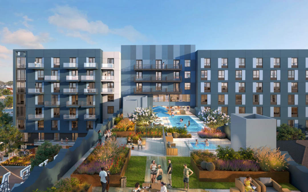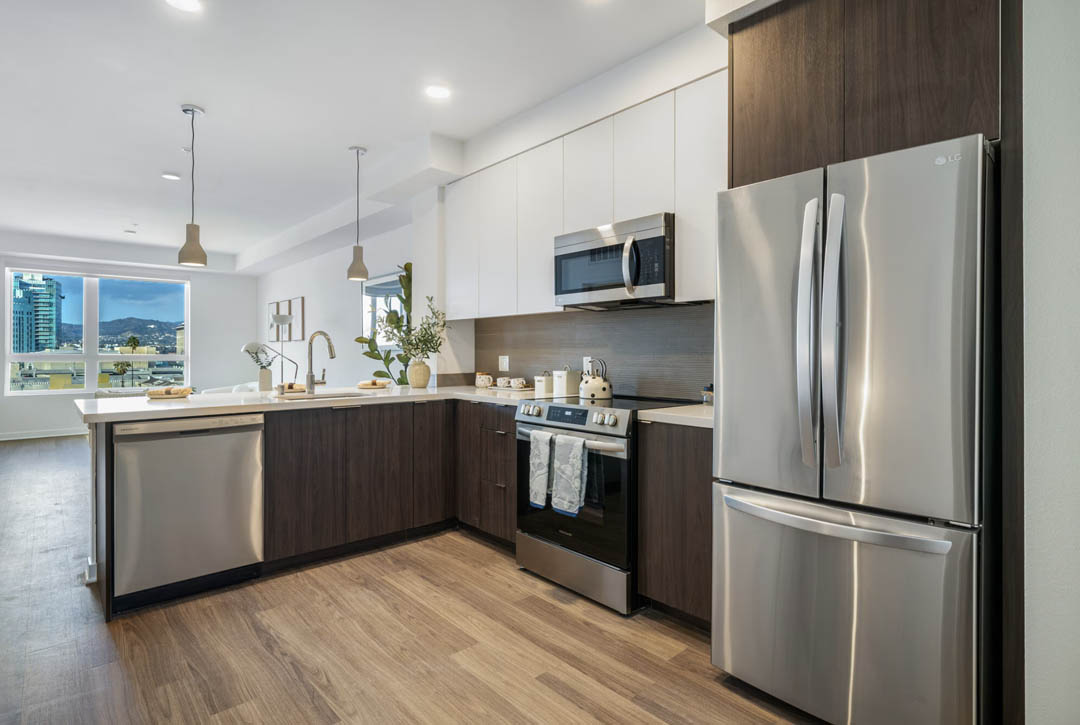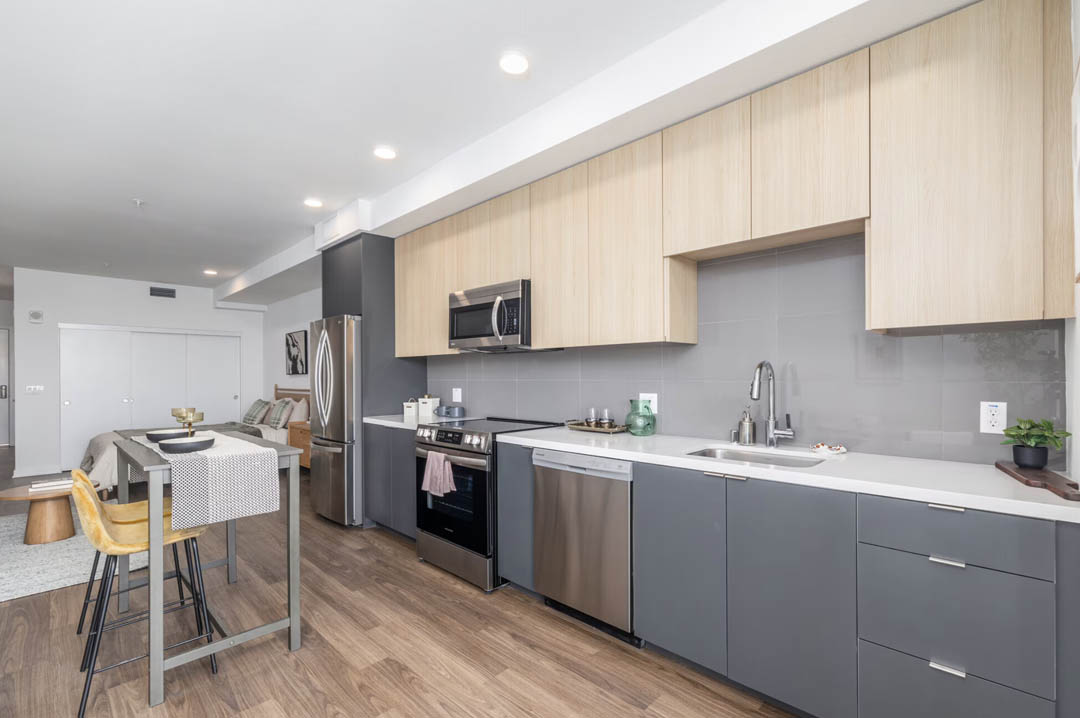 MTD Kitchen partnered with Jamison Services to deliver complete cabinetry solutions for Western Station, the eight story mixed use community located at 800 S Western Avenue in Koreatown. This project includes 230 studio, one and two bedroom apartments built above 13,300 square feet of ground floor retail. The development also incorporates the historic Pellissier Square Garage, which has been repurposed to serve as retail, residential amenities and parking for the new residences. From our state of the art North Hills manufacturing facility, MTD Kitchen designed, manufactured and installed all kitchen and bathroom cabinetry for the project. The interiors feature clean modern finishes, warm wood tones and efficient layouts that support contemporary urban living, complementing KTGY’s bold blue slate exterior design and dynamic façade.