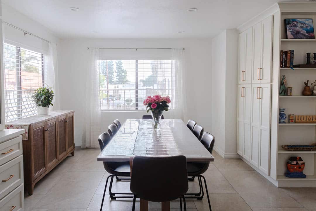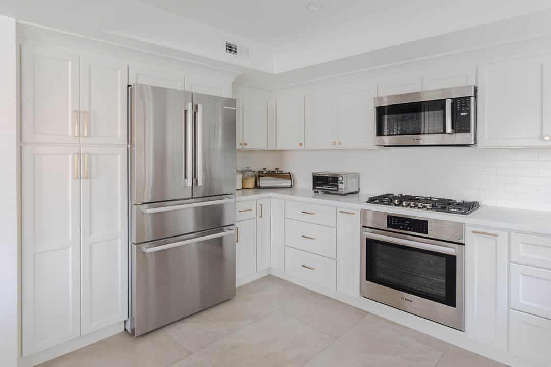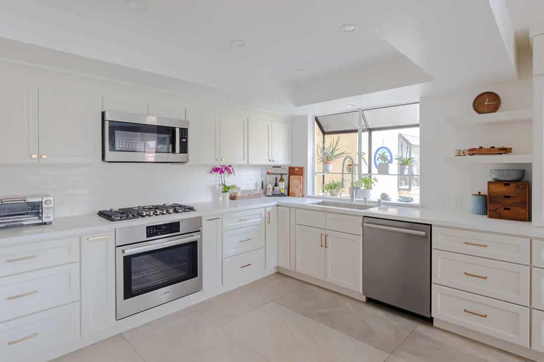 This Tarzana kitchen remodel blends timeless design with modern performance. MTD Kitchen installed custom white shaker cabinetry with warm brass hardware, quartz countertops, and a clean white subway tile backsplash to create a bright, welcoming space.